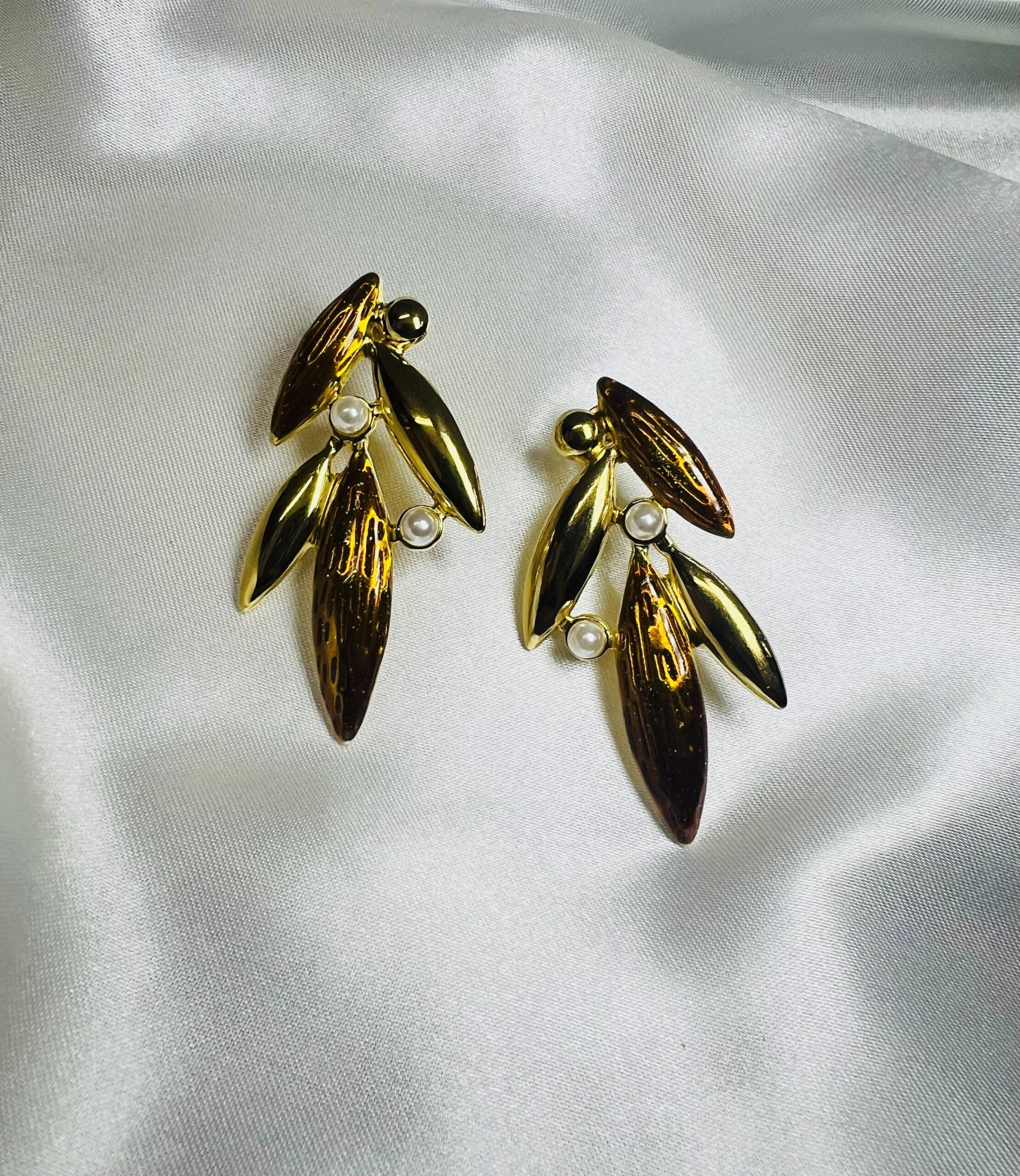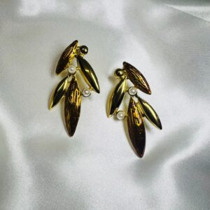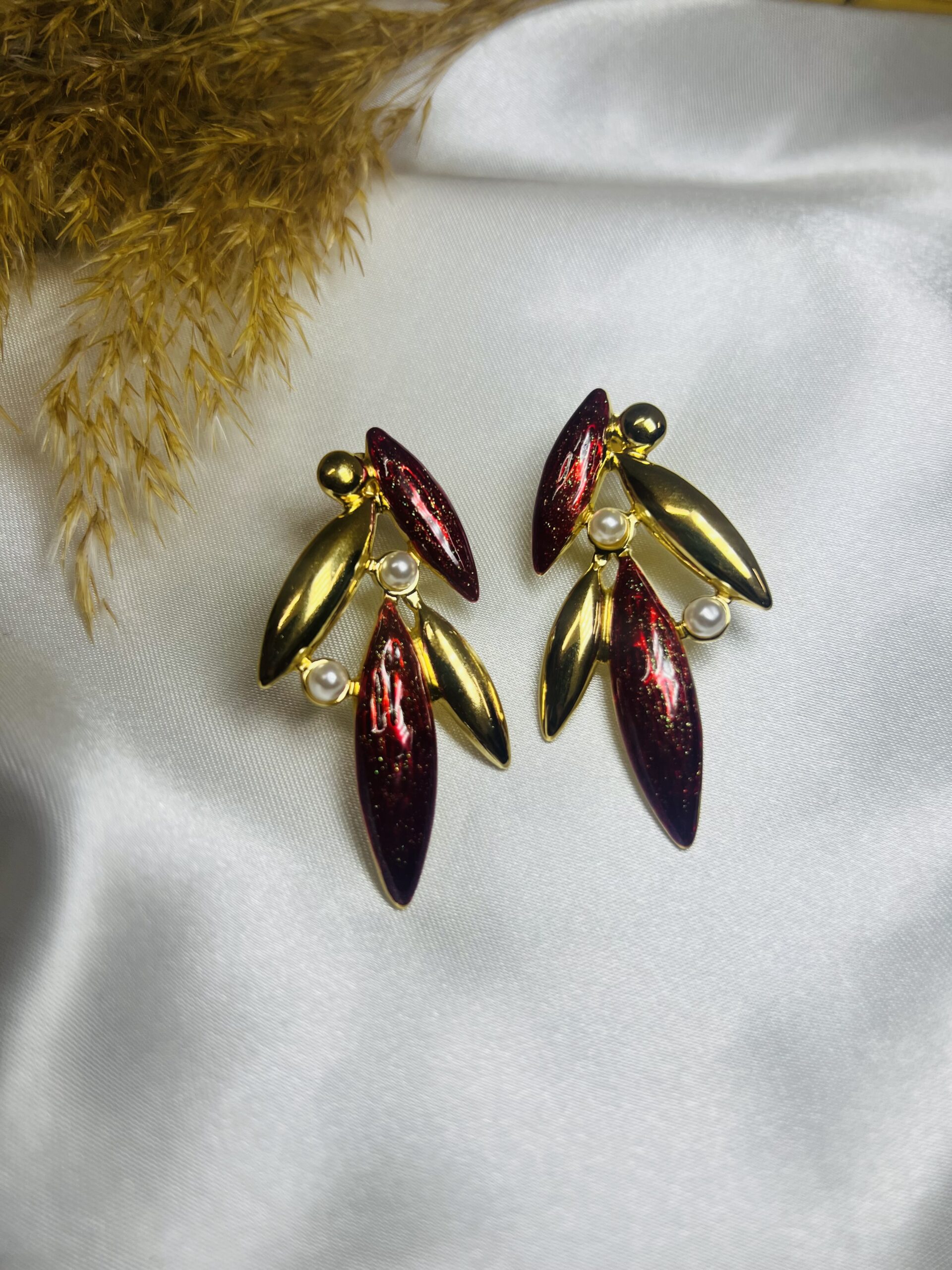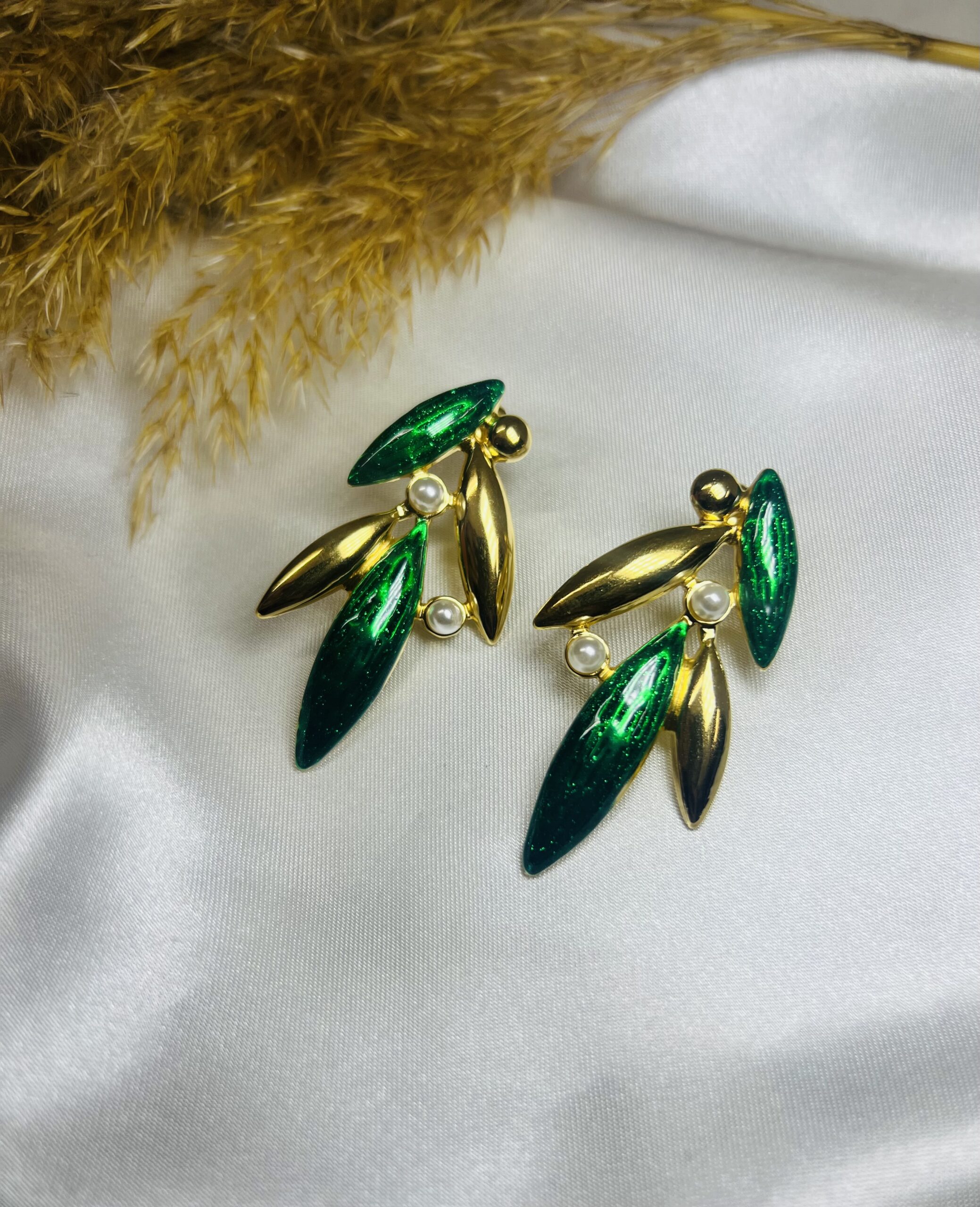 Τρία χρώματα πράσινο, κόκκινο και κίτρινο συναντούν το χρυσό σε αυτό το παιχνιδιάρικο σκουλαρίκι φύλλο, διακοσμημένο με μικρά περλακια για μια δόση κομψής φρεσκάδας. 🍃💛♥️💚